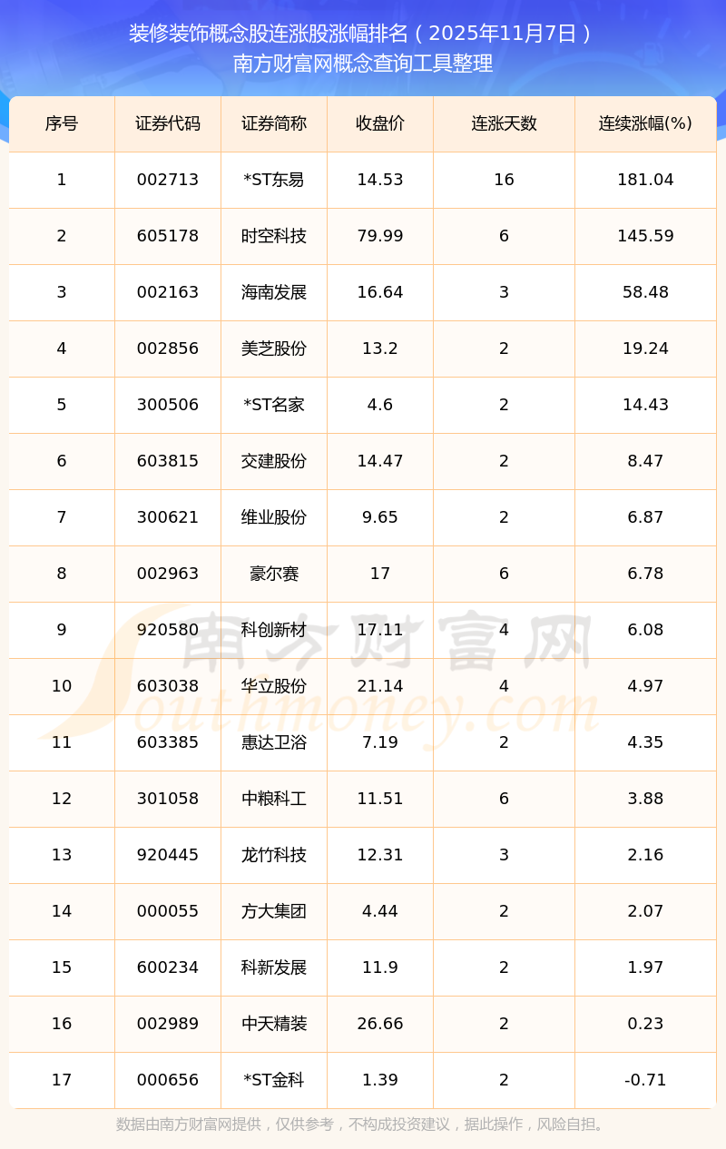 根據(jù)南方財富網(wǎng)概念查詢工具數(shù)據(jù)統(tǒng)計,截止2025年11月7日收盤,裝修裝飾概念股共有17只個股實現(xiàn)連漲。其中連續(xù)漲幅較大的個股有*ST東易、時空科技、海南發(fā)展等,連續(xù)漲幅分別為181.04%、145.59%、58.48%。
