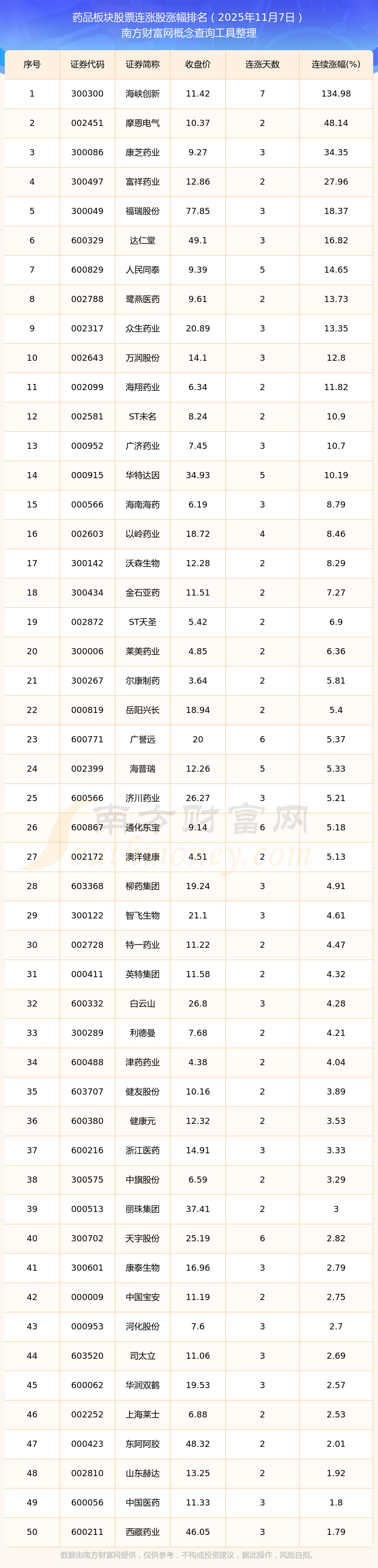 2025年11月7日藥品板塊股票連漲股漲幅排名