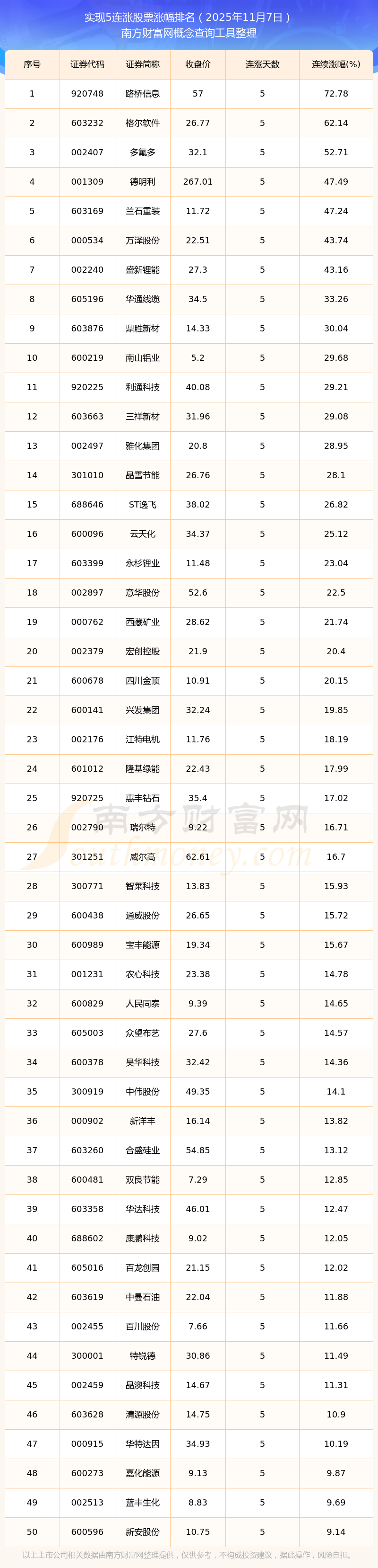 2025年11月7日實現(xiàn)5連漲股票漲幅排名