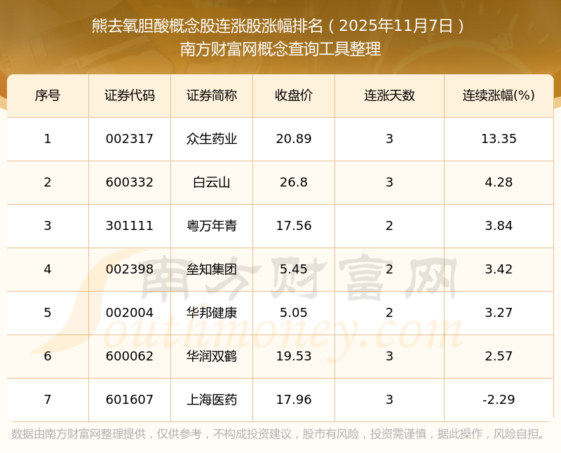 根據(jù)南方財富網(wǎng)概念查詢工具數(shù)據(jù)統(tǒng)計,截止2025年11月7日收盤,熊去氧膽酸概念股共有7只個股實現(xiàn)連漲。其中連續(xù)漲幅較大的個股有眾生藥業(yè)、白云山、粵萬年青等,連續(xù)漲幅分別為13.35%、4.28%、3.84%。