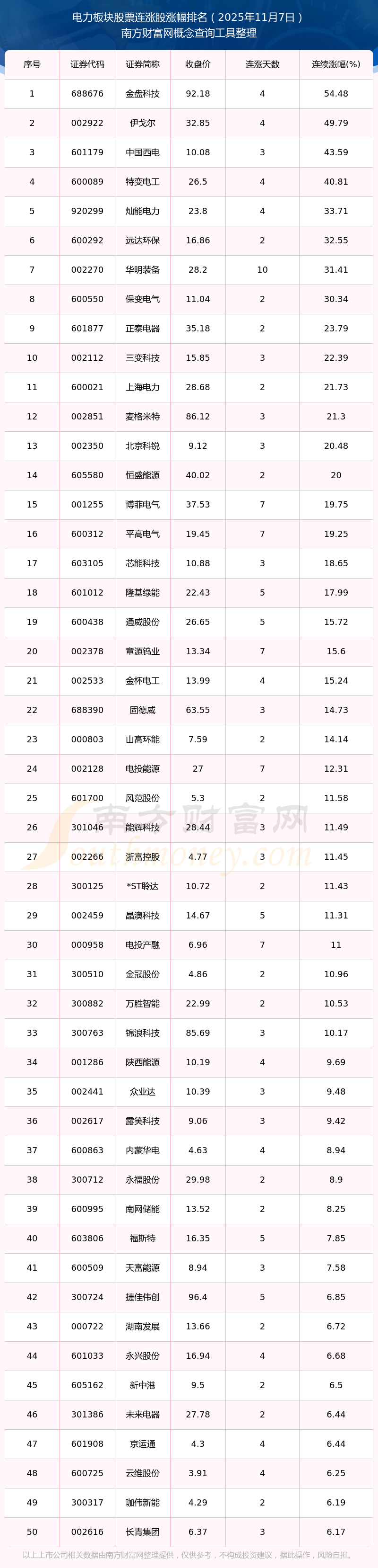 2025年11月7日電力板塊股票連漲股漲幅排名