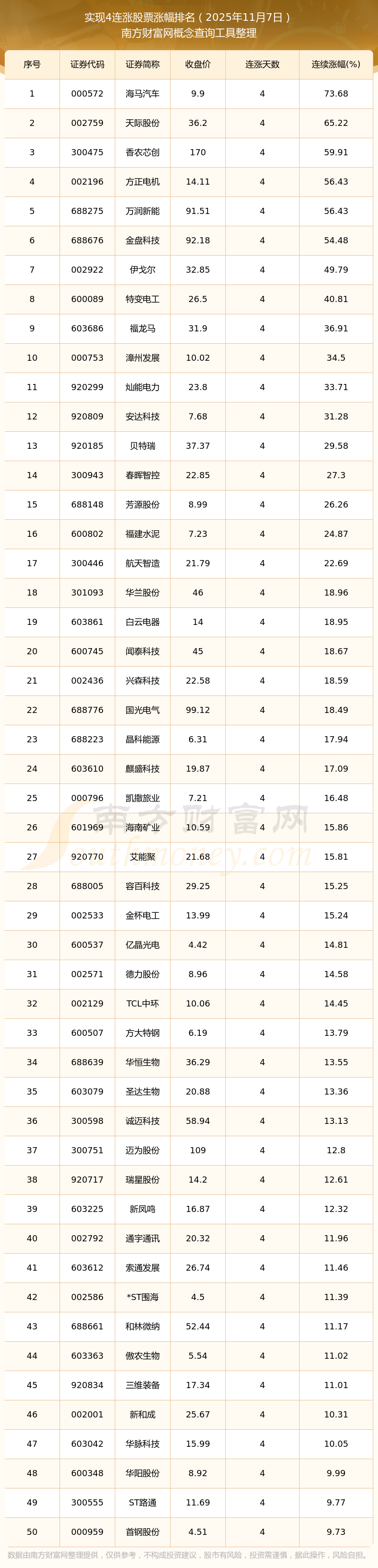 根據(jù)南方財富網(wǎng)概念查詢工具數(shù)據(jù)統(tǒng)計,截止2025年11月7日收盤,共有122只個股實現(xiàn)4天連漲。其中連續(xù)漲幅較大的個股有海馬汽車、天際股份、香農(nóng)芯創(chuàng)等,連續(xù)漲幅分別為73.68%、65.22%、59.91%。