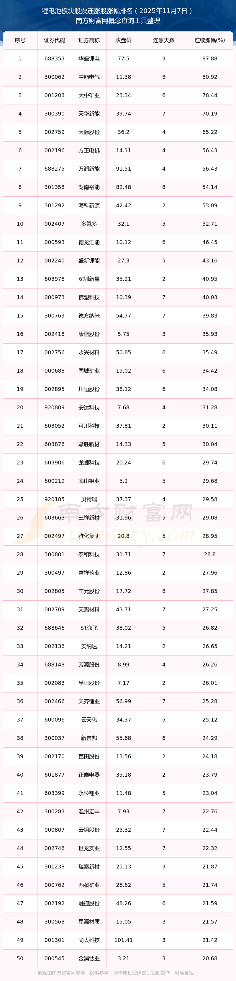 2025年11月7日鋰電池板塊股票連漲股漲幅排名