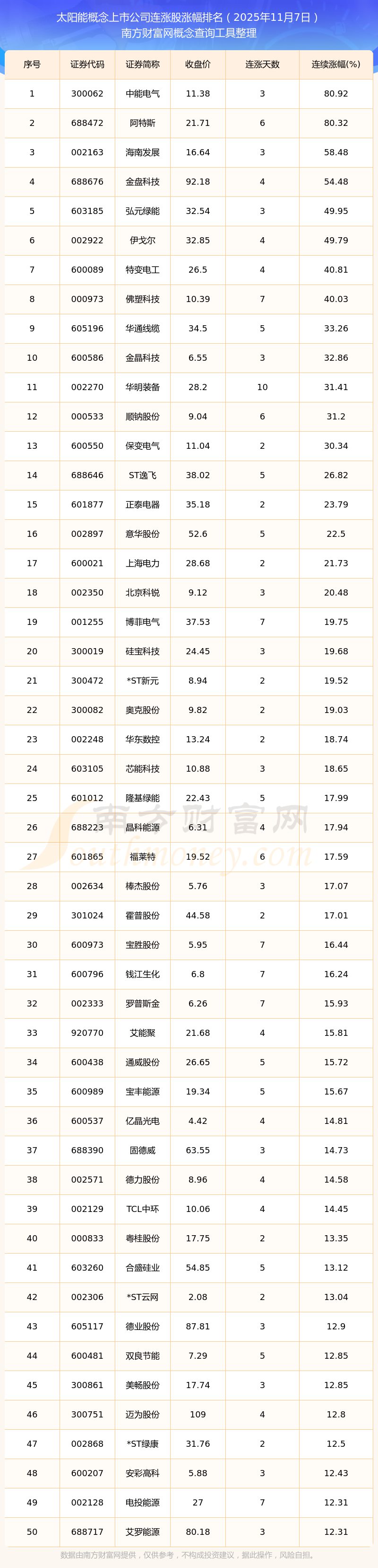 2025年11月7日太陽能概念上市公司連漲股漲幅排名