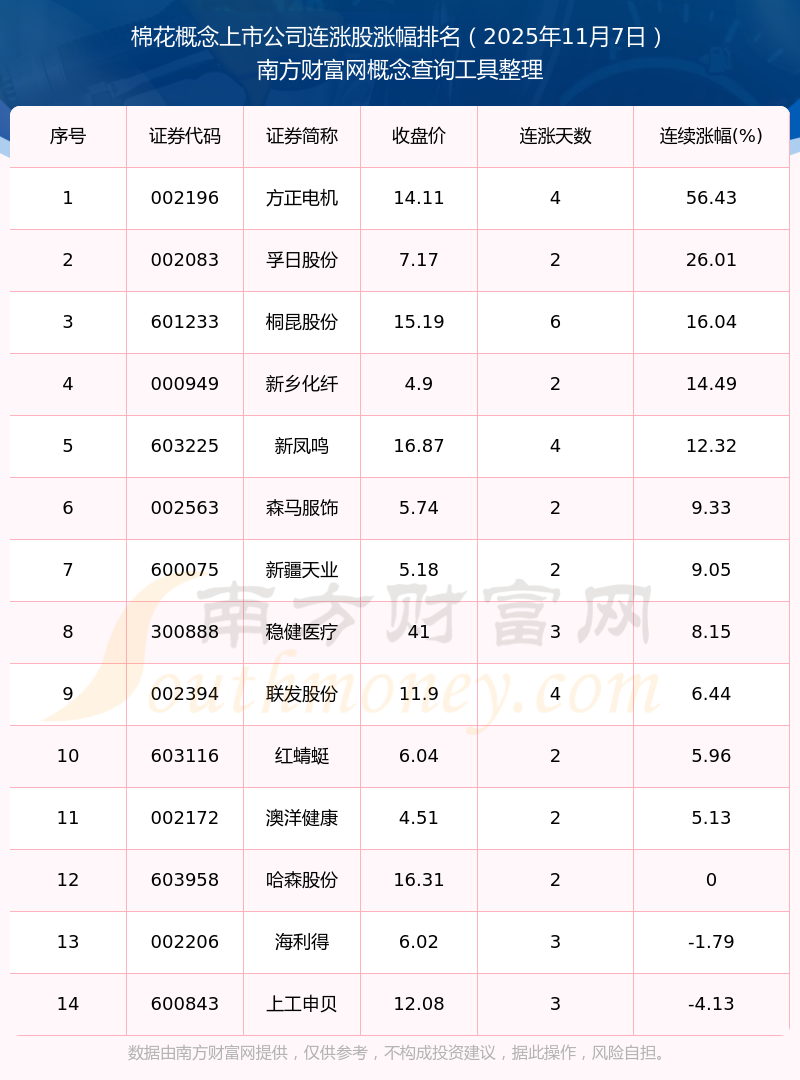 2025年11月7日棉花概念上市公司連漲股漲幅排名