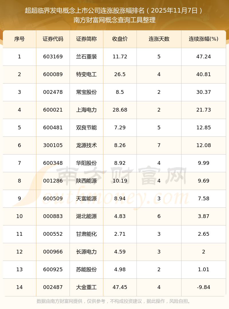 2025年11月7日超超臨界發(fā)電概念上市公司連漲股漲幅排名