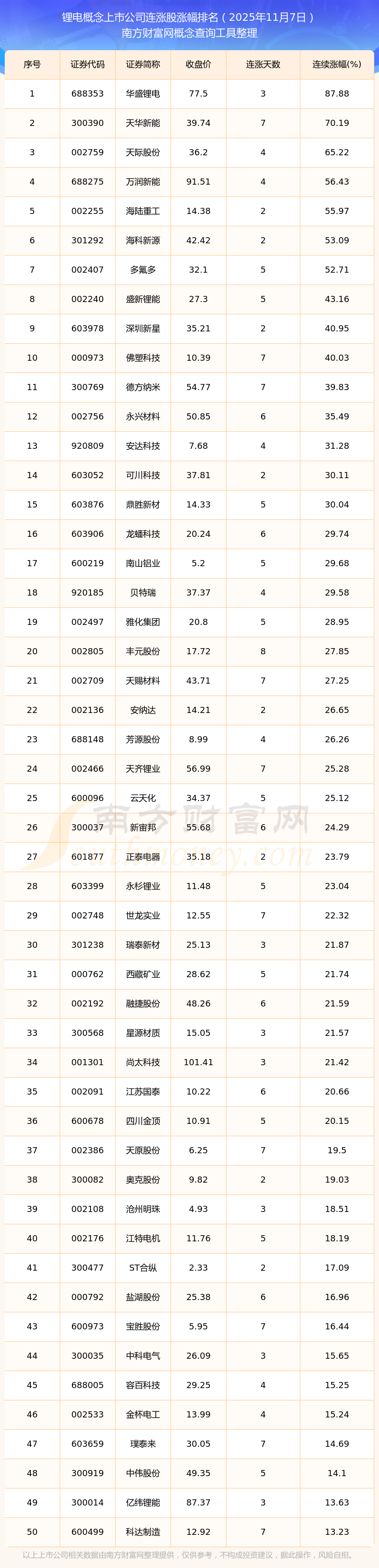 2025年11月7日鋰電概念上市公司連漲股漲幅排名