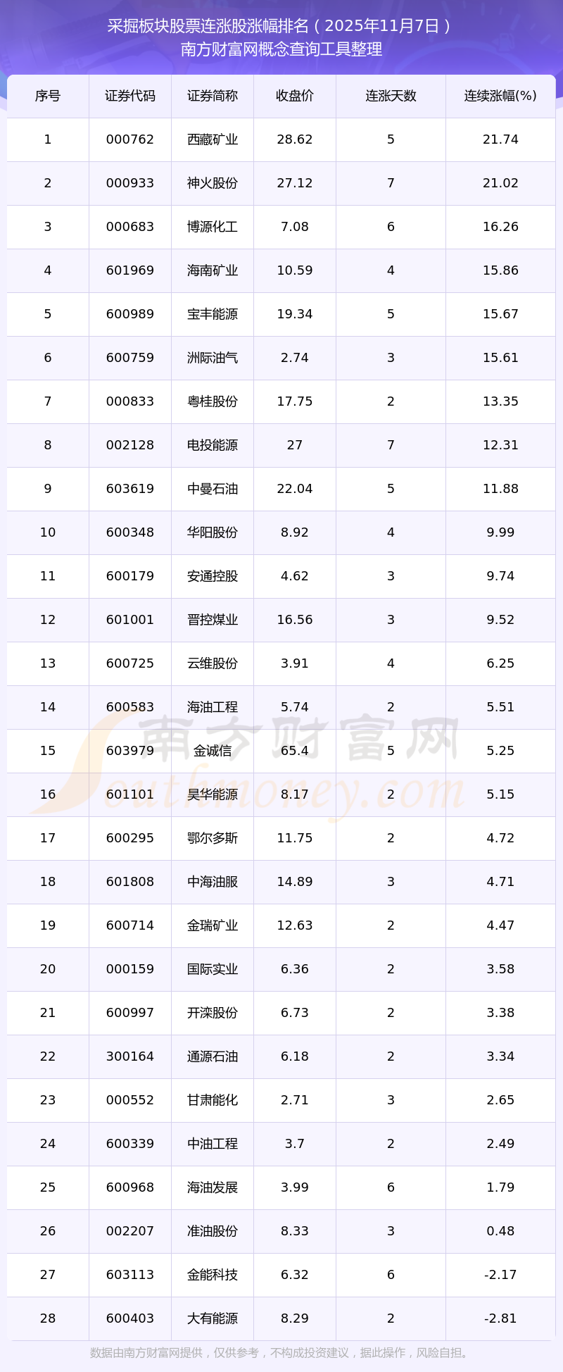 2025年11月7日采掘板塊股票連漲股漲幅排名