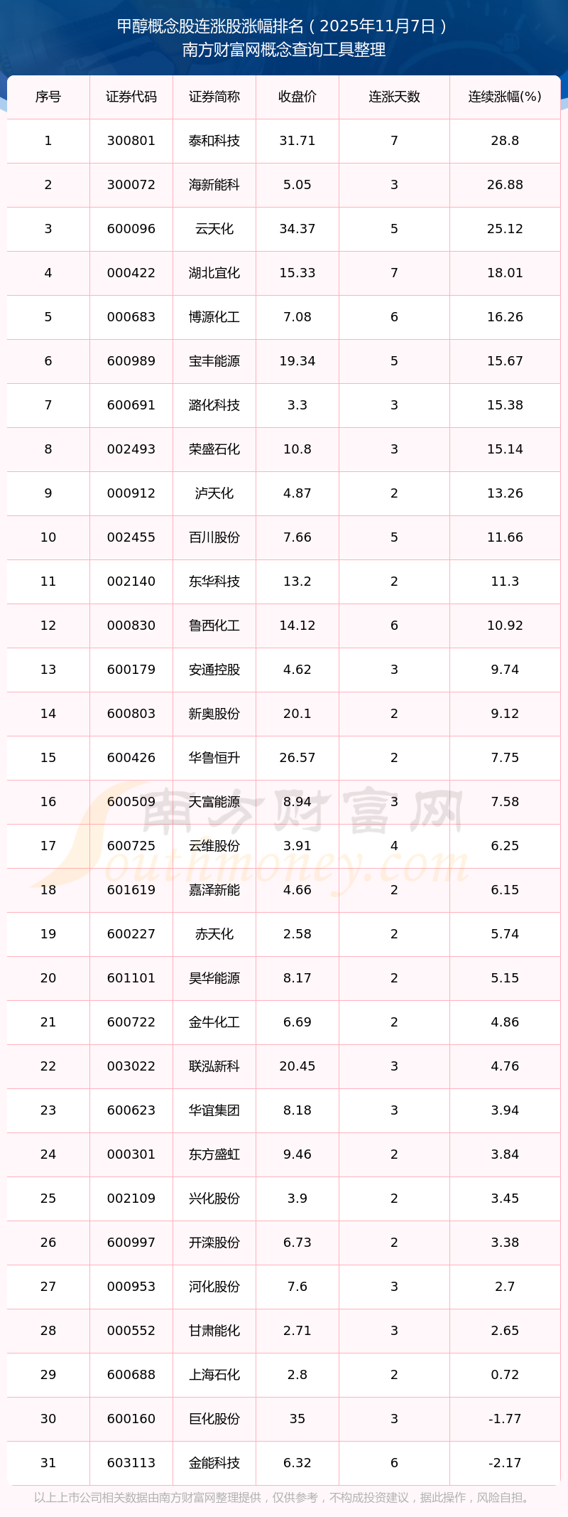 2025年11月7日甲醇概念股連漲股漲幅排名