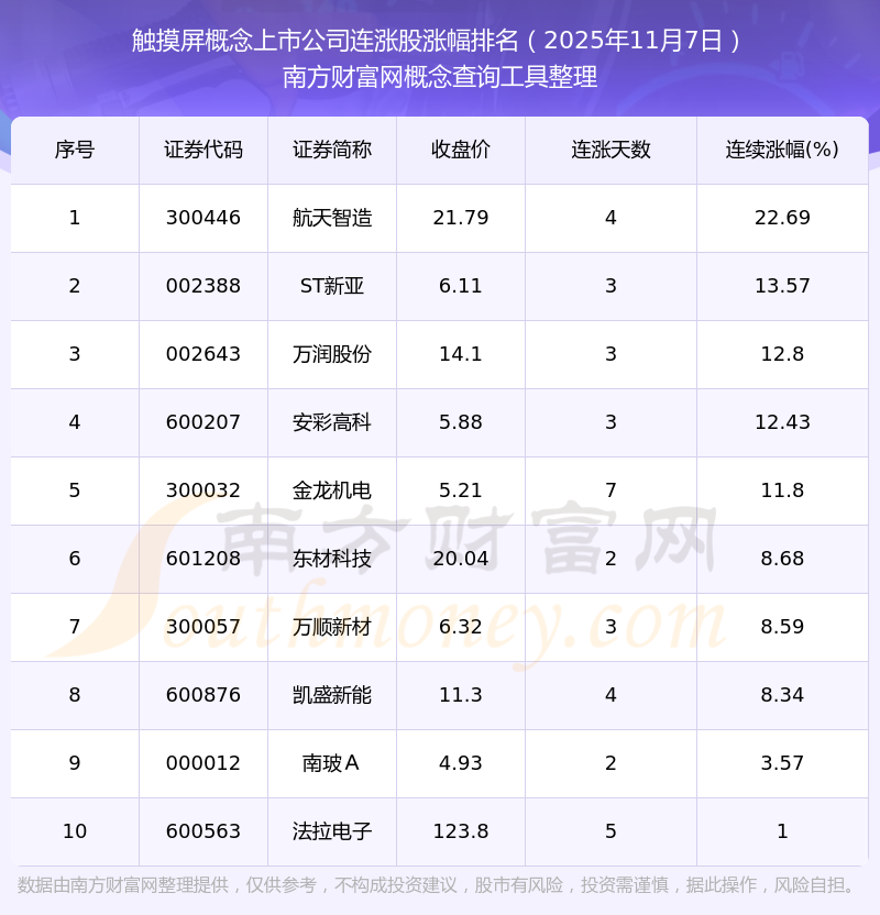 根據(jù)南方財富網(wǎng)概念查詢工具數(shù)據(jù)統(tǒng)計,截止2025年11月7日收盤,觸摸屏概念上市公司共有10只個股實現(xiàn)連漲。其中連續(xù)漲幅較大的個股有航天智造、ST新亞、萬潤股份等,連續(xù)漲幅分別為22.69%、13.57%、12.80%。
