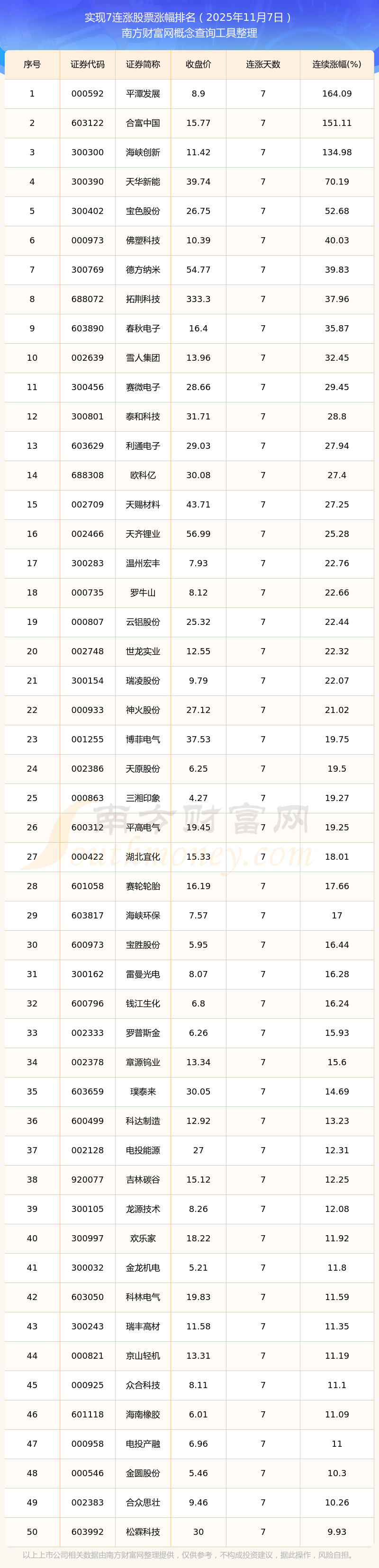 根據(jù)南方財(cái)富網(wǎng)概念查詢工具數(shù)據(jù)統(tǒng)計(jì),截止2025年11月7日收盤,共有68只個(gè)股實(shí)現(xiàn)7天連漲。其中連續(xù)漲幅較大的個(gè)股有平潭發(fā)展、合富中國(guó)、海峽創(chuàng)新等,連續(xù)漲幅分別為164.09%、151.11%、134.98%。