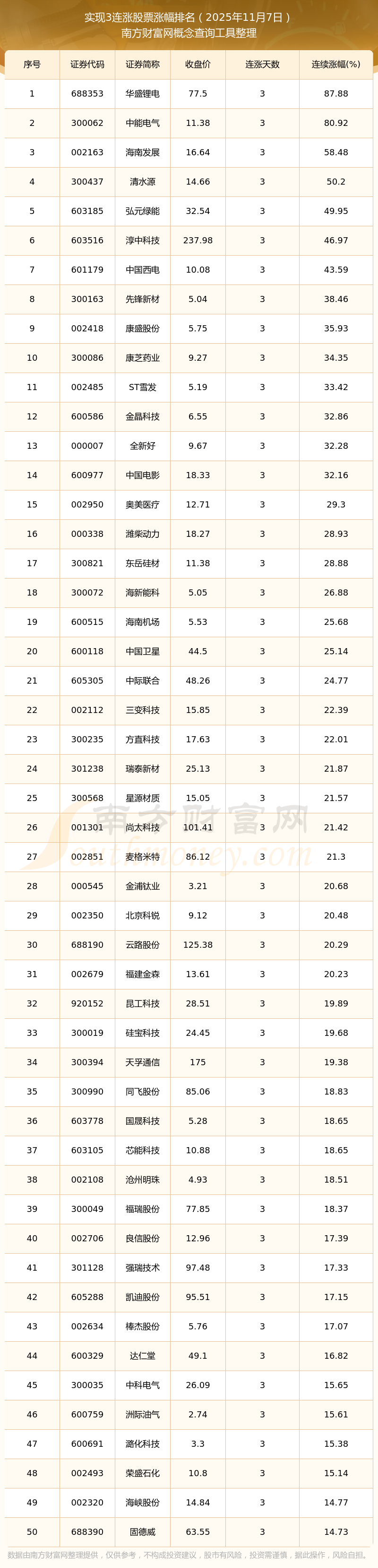 2025年11月7日實現(xiàn)3連漲股票漲幅排名