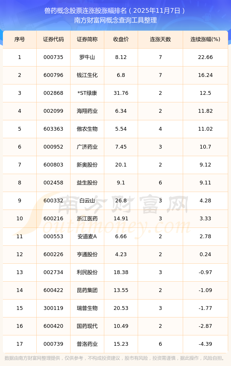 2025年11月7日獸藥概念股票連漲股漲幅排名