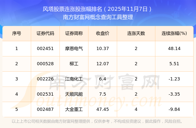 根據(jù)南方財富網(wǎng)概念查詢工具數(shù)據(jù)統(tǒng)計,截止2025年11月7日收盤,風塔股票共有5只個股實現(xiàn)連漲。其中連續(xù)漲幅較大的個股有摩恩電氣、柳工、江南化工等,連續(xù)漲幅分別為48.14%、5.51%、-1.23%。