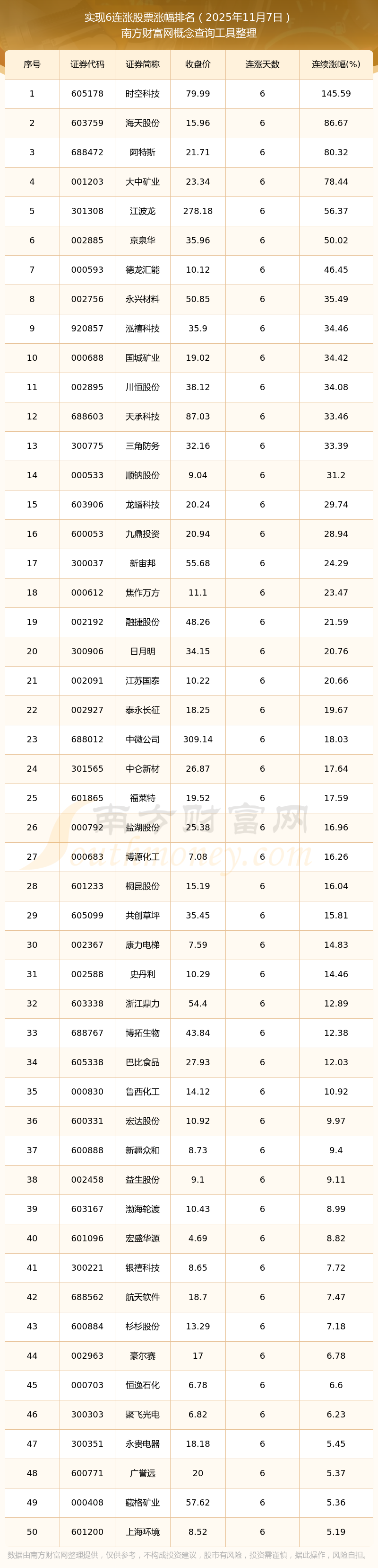 根據(jù)南方財(cái)富網(wǎng)概念查詢工具數(shù)據(jù)統(tǒng)計(jì),截止2025年11月7日收盤,共有77只個股實(shí)現(xiàn)6天連漲。其中連續(xù)漲幅較大的個股有時空科技、海天股份、阿特斯等,連續(xù)漲幅分別為145.59%、86.67%、80.32%。