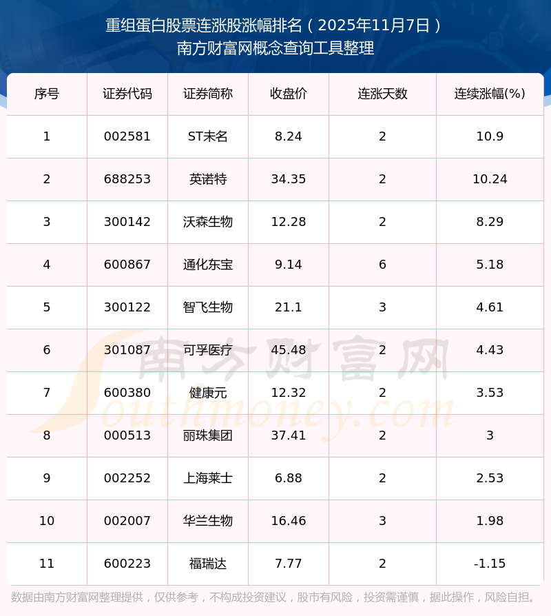 2025年11月7日重組蛋白股票連漲股票漲幅排名
