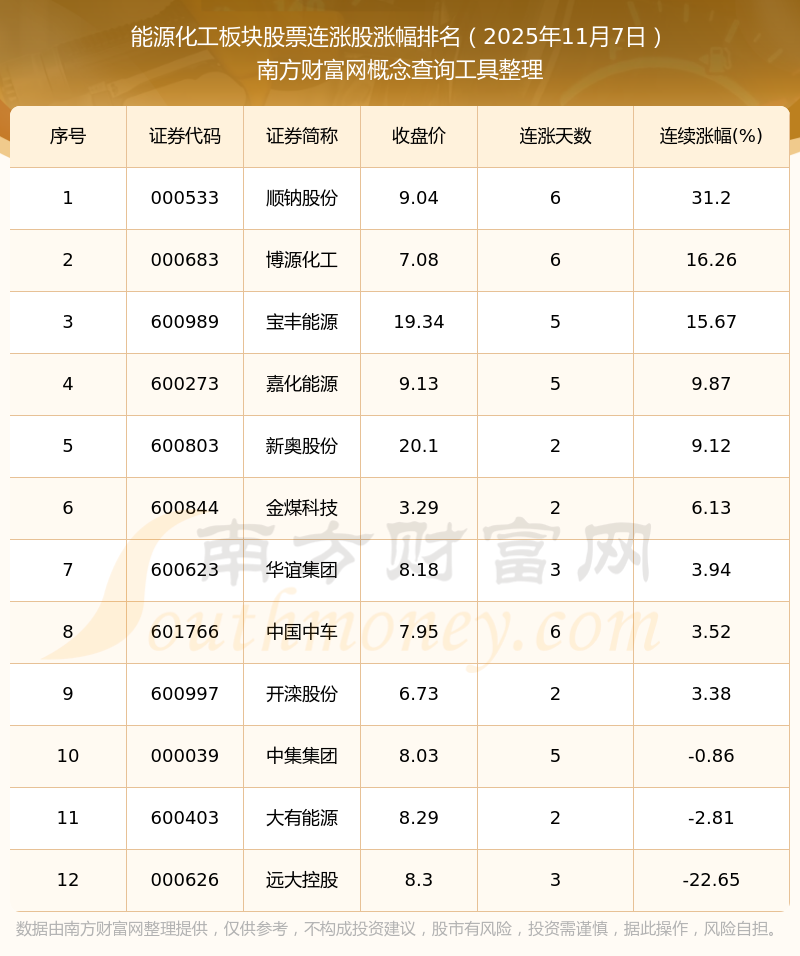 2025年11月7日能源化工板塊股票連漲股漲幅排名