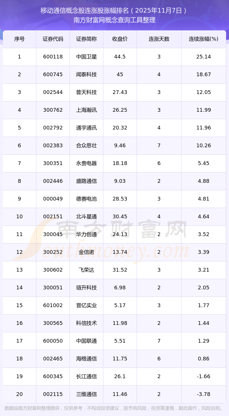 2025年11月7日移動通信概念股連漲股漲幅排名