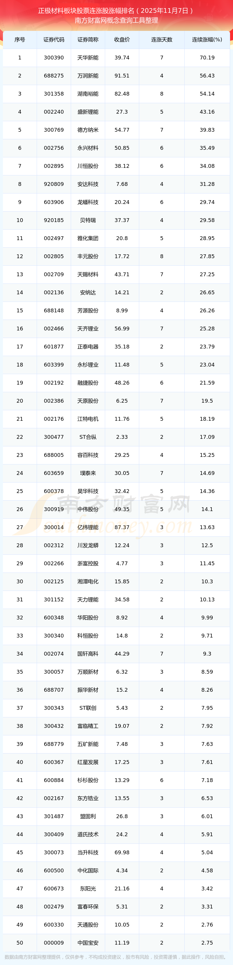 2025年11月7日正極材料板塊股票連漲股漲幅排名