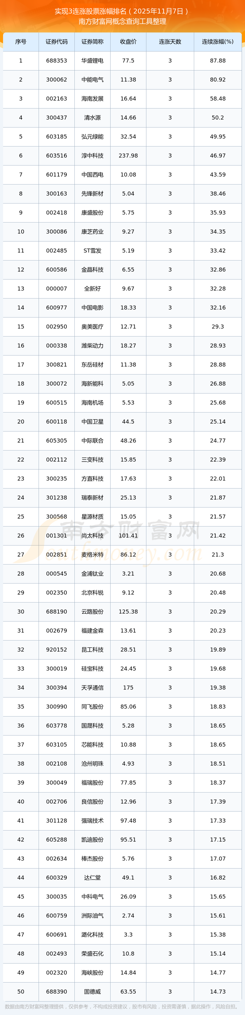 2025年11月7日實(shí)現(xiàn)3連漲股票漲幅排名