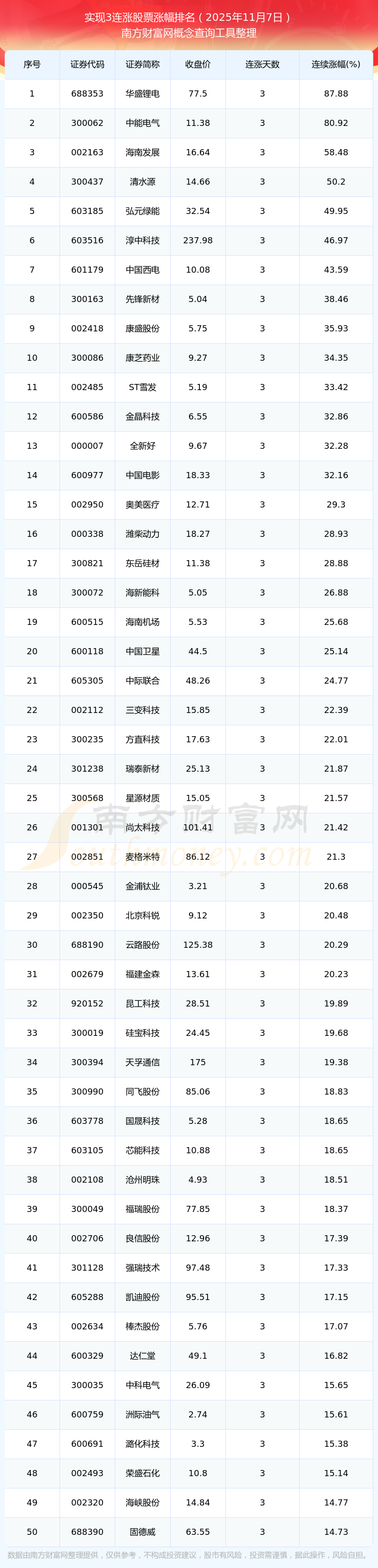 2025年11月7日實現(xiàn)3連漲股票漲幅排名
