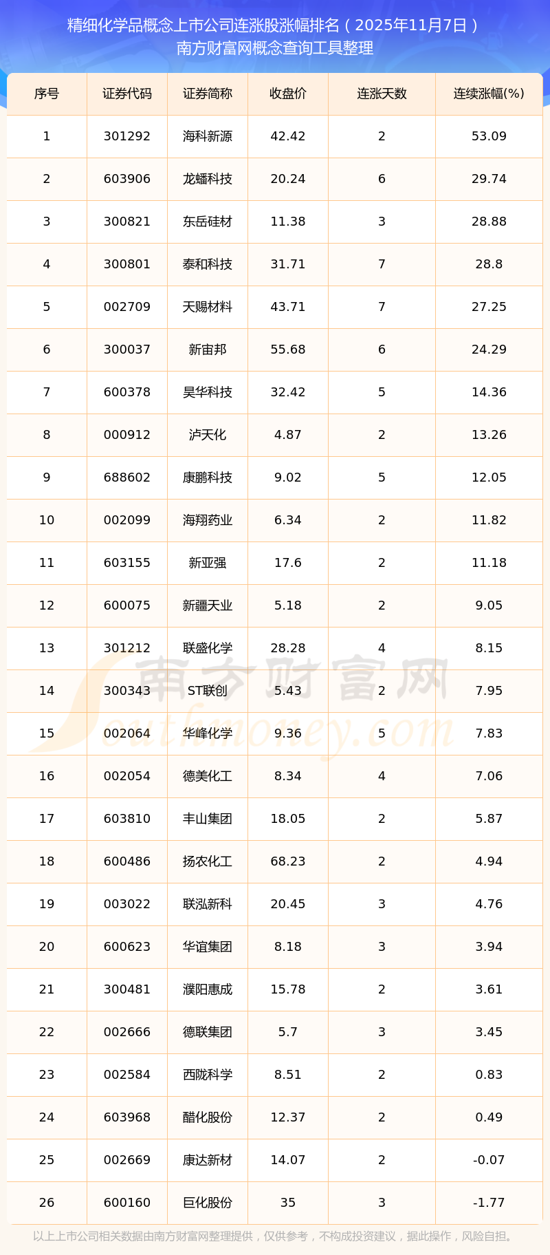 根據(jù)南方財富網(wǎng)概念查詢工具數(shù)據(jù)統(tǒng)計,截止2025年11月7日收盤,精細化學品概念上市公司共有26只個股實現(xiàn)連漲。其中連續(xù)漲幅較大的個股有?菩略础報纯萍、東岳硅材等,連續(xù)漲幅分別為53.09%、29.74%、28.88%。