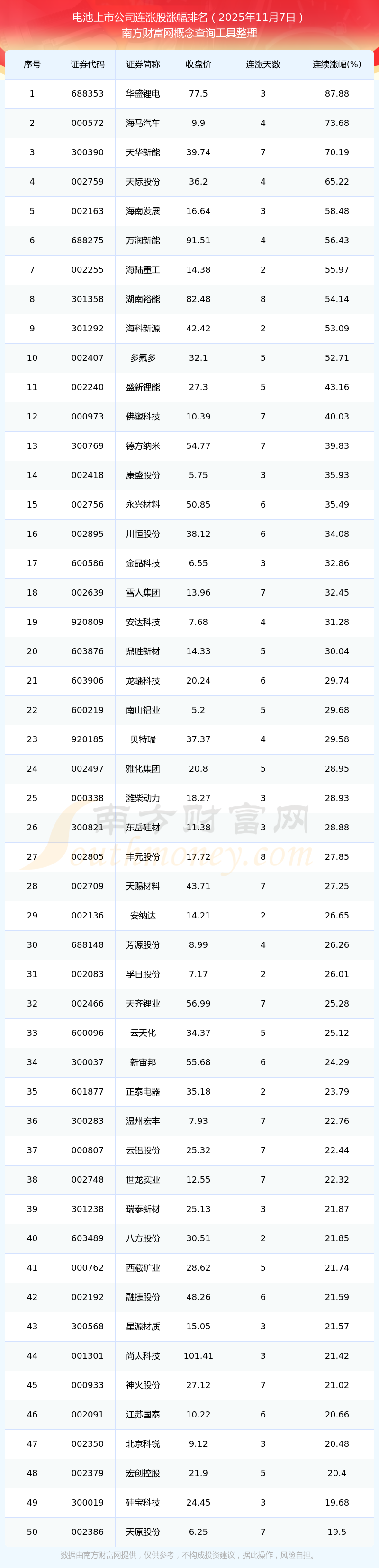 根據(jù)南方財富網(wǎng)概念查詢工具數(shù)據(jù)統(tǒng)計,截止2025年11月7日收盤,電池上市公司共有240只個股實現(xiàn)連漲。其中連續(xù)漲幅較大的個股有華盛鋰電、海馬汽車、天華新能等,連續(xù)漲幅分別為87.88%、73.68%、70.19%。