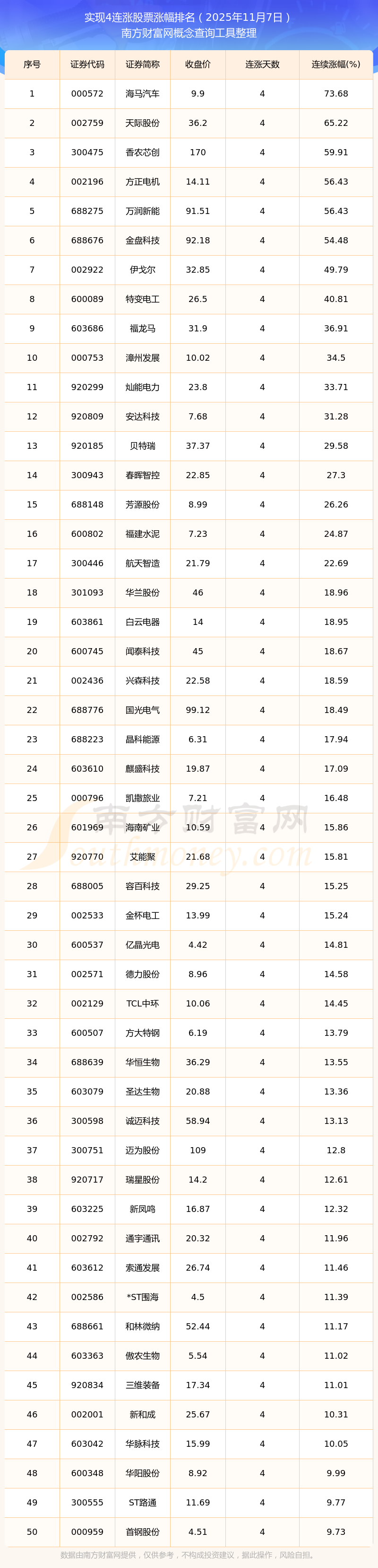 根據(jù)南方財(cái)富網(wǎng)概念查詢工具數(shù)據(jù)統(tǒng)計(jì),截止2025年11月7日收盤,共有122只個股實(shí)現(xiàn)4天連漲。其中連續(xù)漲幅較大的個股有海馬汽車、天際股份、香農(nóng)芯創(chuàng)等,連續(xù)漲幅分別為73.68%、65.22%、59.91%。