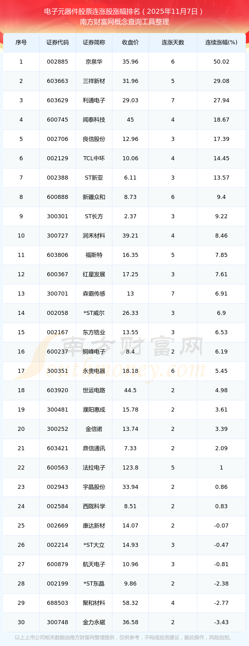 根據(jù)南方財(cái)富網(wǎng)概念查詢工具數(shù)據(jù)統(tǒng)計(jì),截止2025年11月7日收盤,電子元器件股票共有30只個(gè)股實(shí)現(xiàn)連漲。其中連續(xù)漲幅較大的個(gè)股有京泉華、三祥新材、利通電子等,連續(xù)漲幅分別為50.02%、29.08%、27.94%。
