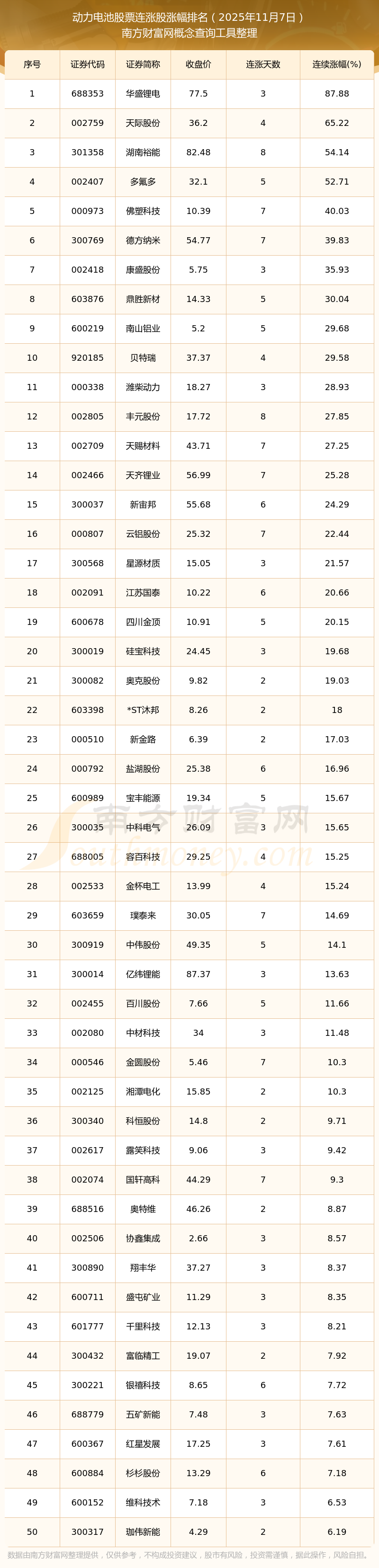 根據(jù)南方財富網(wǎng)概念查詢工具數(shù)據(jù)統(tǒng)計,截止2025年11月7日收盤,動力電池股票共有80只個股實現(xiàn)連漲。其中連續(xù)漲幅較大的個股有華盛鋰電、天際股份、湖南裕能等,連續(xù)漲幅分別為87.88%、65.22%、54.14%。