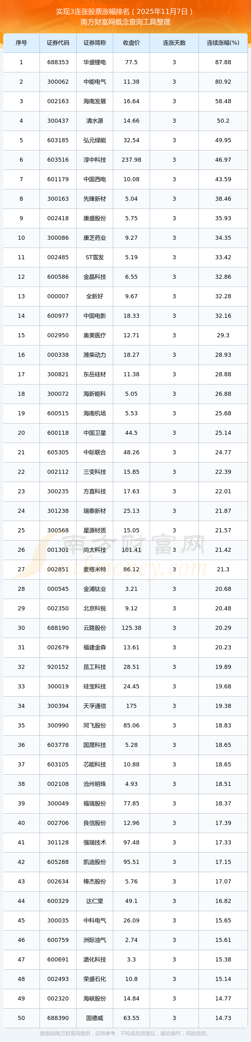 2025年11月7日實(shí)現(xiàn)3連漲股票漲幅排名