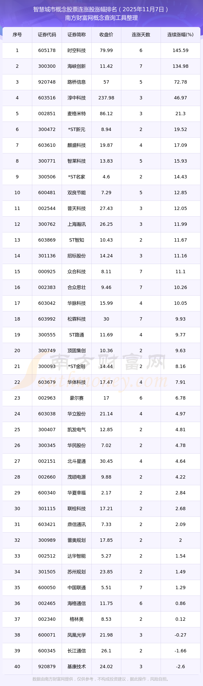 2025年11月7日智慧城市概念股票連漲股漲幅排名