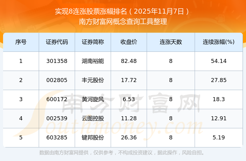 2025年11月7日實(shí)現(xiàn)8連漲股票漲幅排名