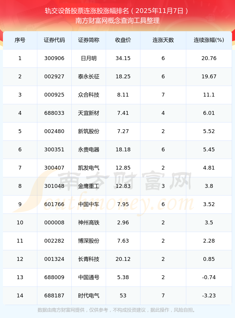 根據(jù)南方財(cái)富網(wǎng)概念查詢工具數(shù)據(jù)統(tǒng)計(jì),截止2025年11月7日收盤,軌交設(shè)備股票共有14只個(gè)股實(shí)現(xiàn)連漲。其中連續(xù)漲幅較大的個(gè)股有日月明、泰永長征、眾合科技等,連續(xù)漲幅分別為20.76%、19.67%、11.10%。