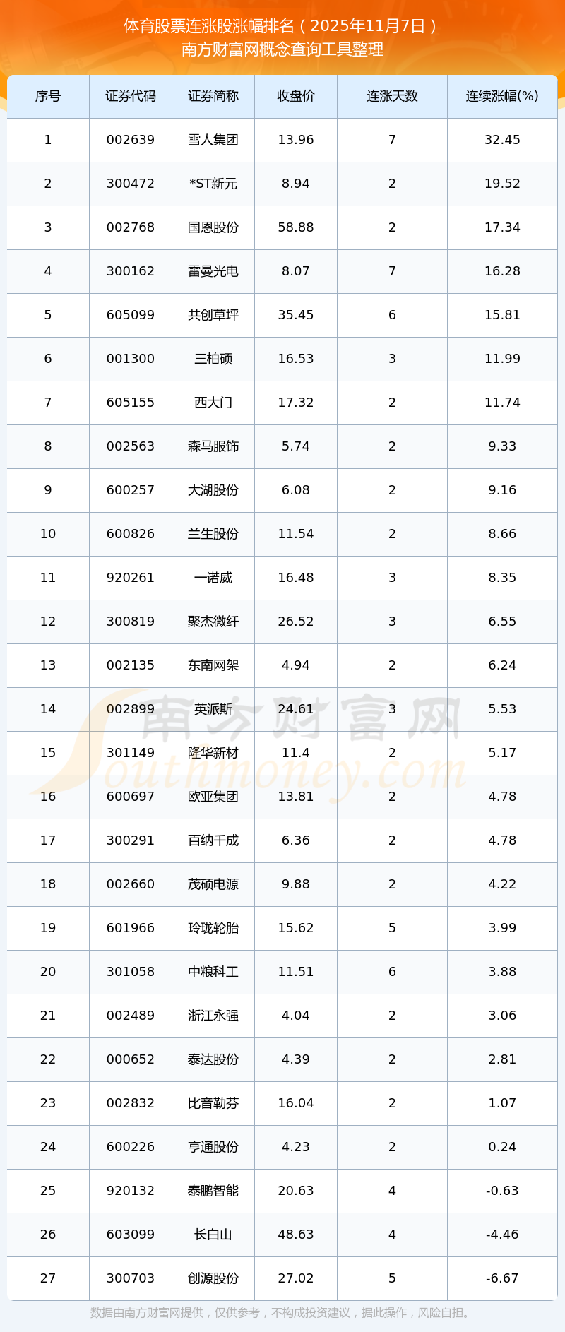 根據(jù)南方財(cái)富網(wǎng)概念查詢工具數(shù)據(jù)統(tǒng)計(jì),截止2025年11月7日收盤,體育股票共有27只個(gè)股實(shí)現(xiàn)連漲。其中連續(xù)漲幅較大的個(gè)股有雪人集團(tuán)、*ST新元、國恩股份等,連續(xù)漲幅分別為32.45%、19.52%、17.34%。