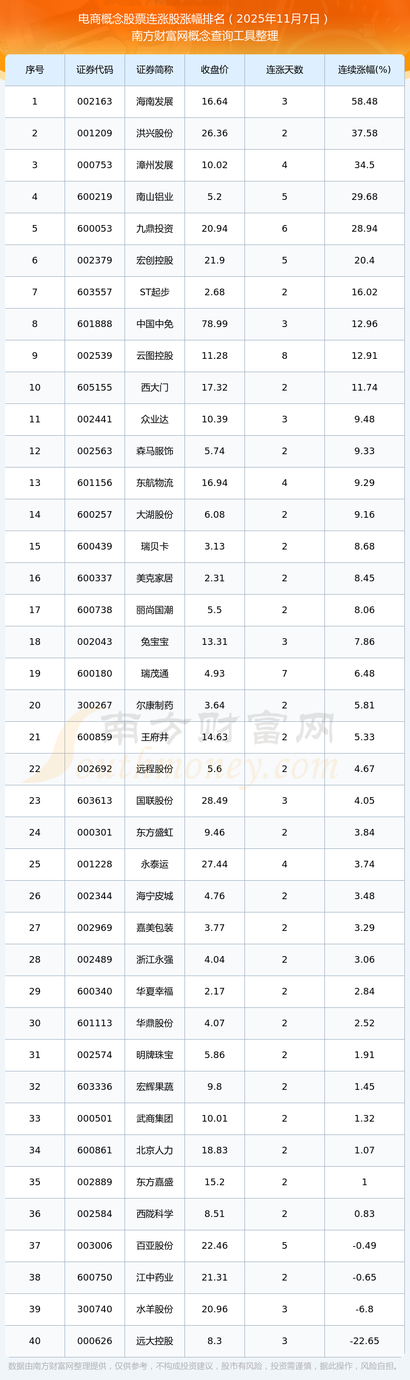 根據(jù)南方財富網(wǎng)概念查詢工具數(shù)據(jù)統(tǒng)計,截止2025年11月7日收盤,電商概念股票共有40只個股實現(xiàn)連漲。其中連續(xù)漲幅較大的個股有海南發(fā)展、洪興股份、漳州發(fā)展等,連續(xù)漲幅分別為58.48%、37.58%、34.50%。