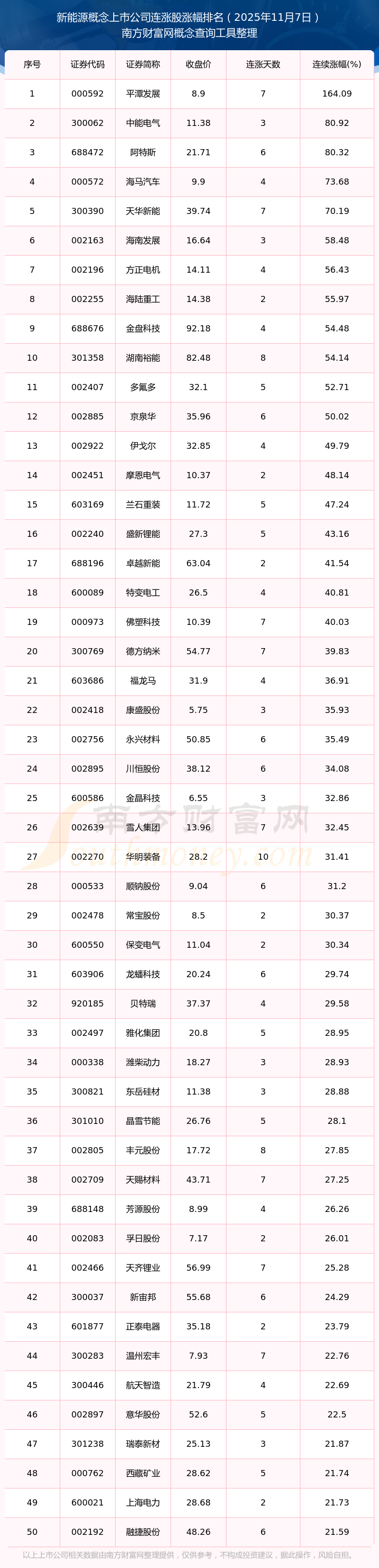 2025年11月7日新能源概念上市公司連漲股漲幅排名