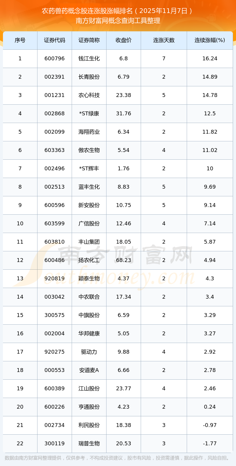 2025年11月7日農(nóng)藥獸藥概念股連漲股漲幅排名