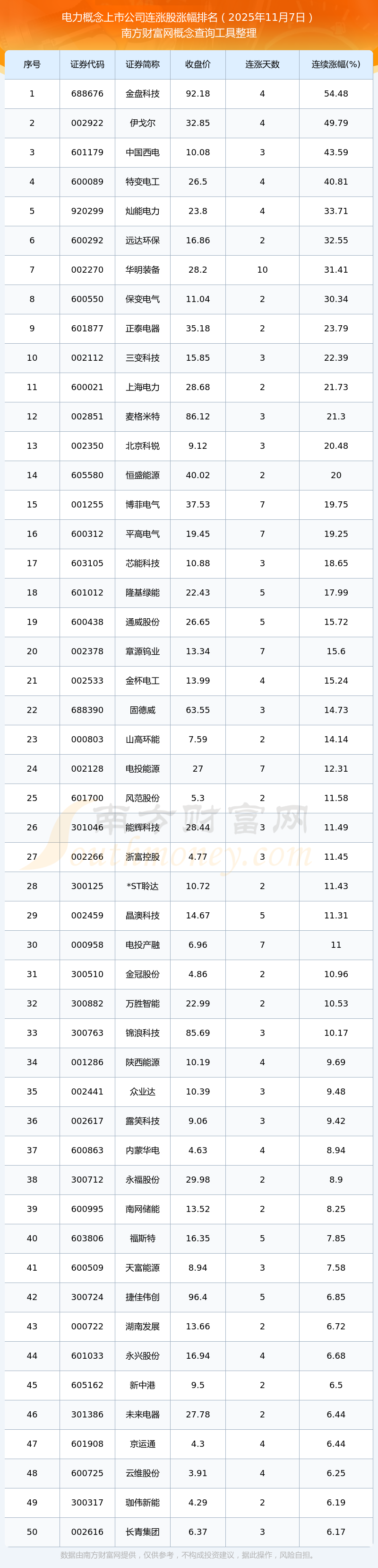 2025年11月7日電力概念上市公司連漲股漲幅排名