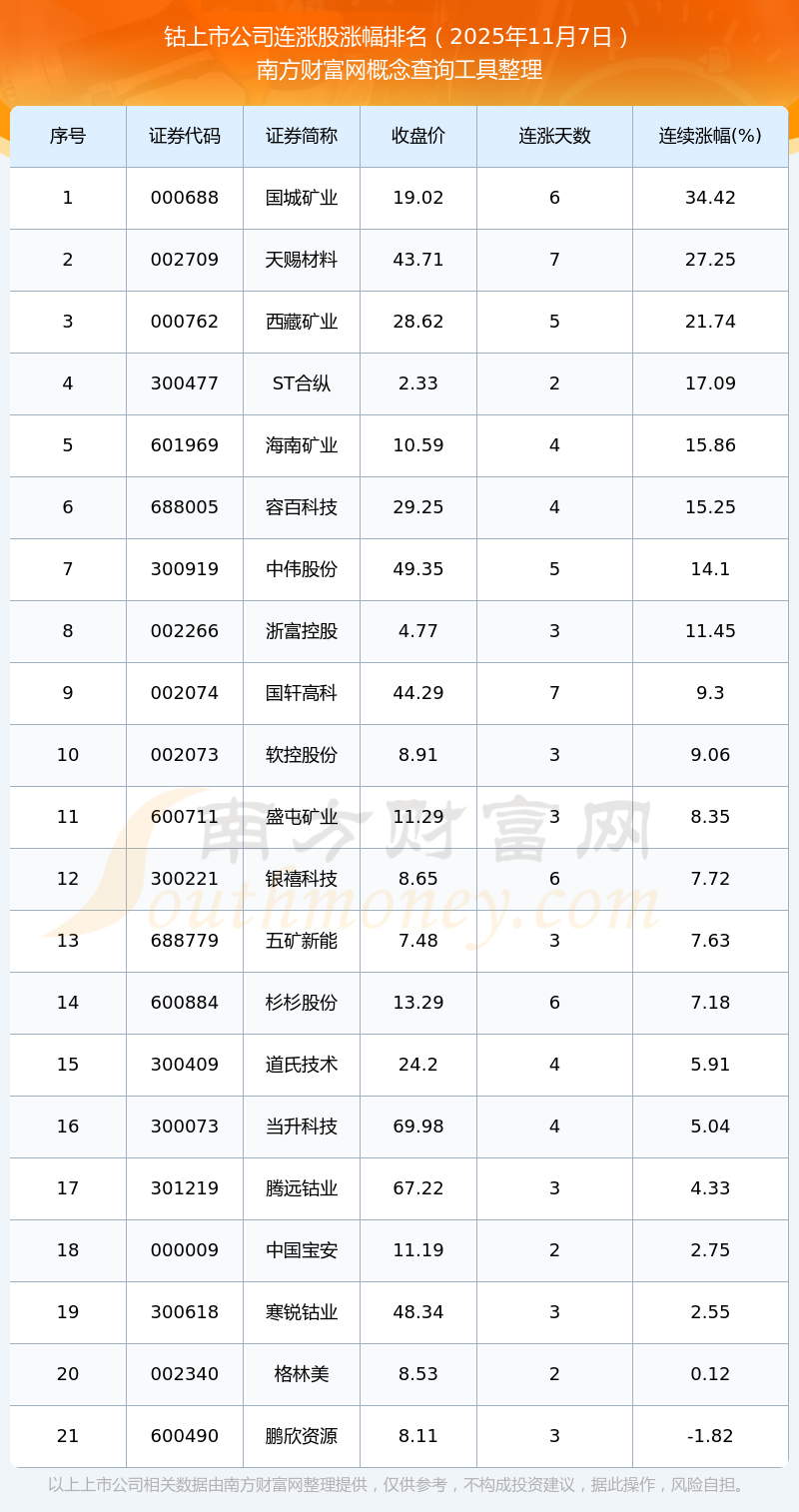 2025年11月7日鈷上市公司連漲股漲幅排名