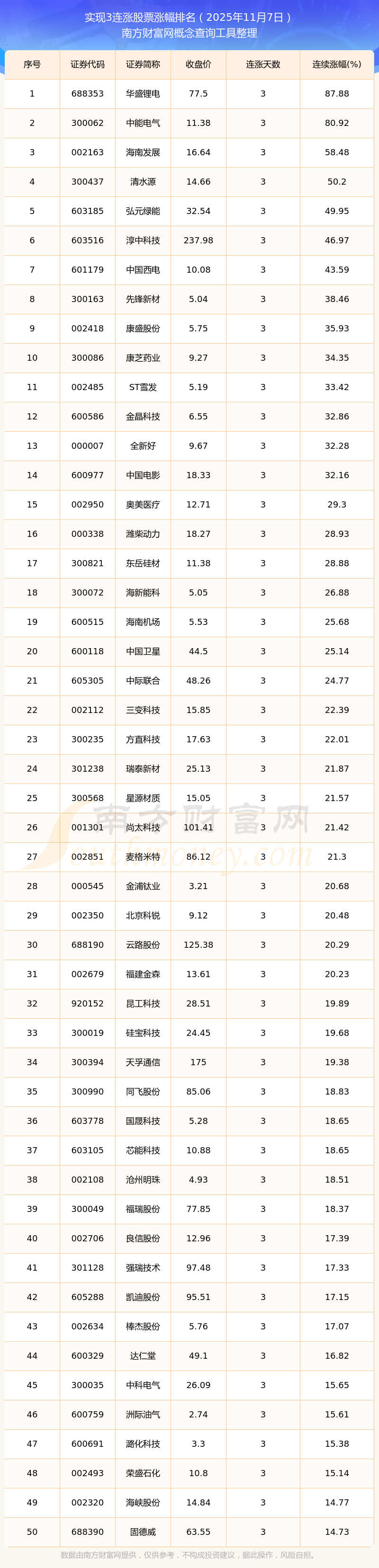 2025年11月7日實(shí)現(xiàn)3連漲股票漲幅排名