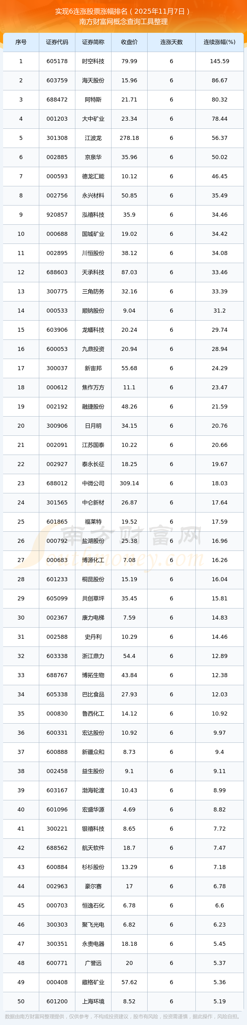2025年11月7日實(shí)現(xiàn)6連漲股票漲幅排名