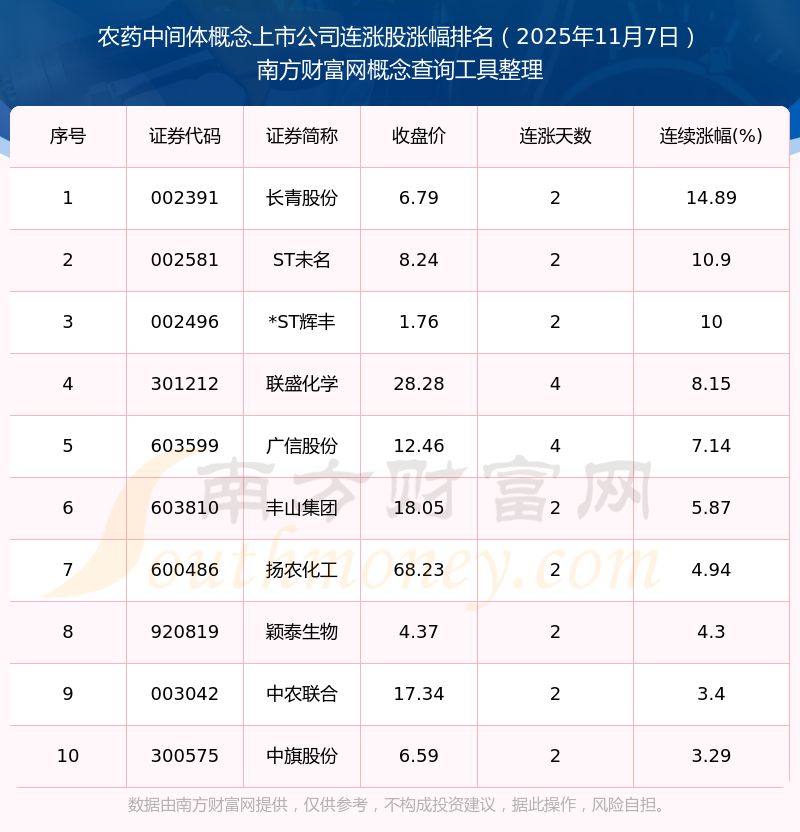 2025年11月7日農(nóng)藥中間體概念上市公司連漲股漲幅排名