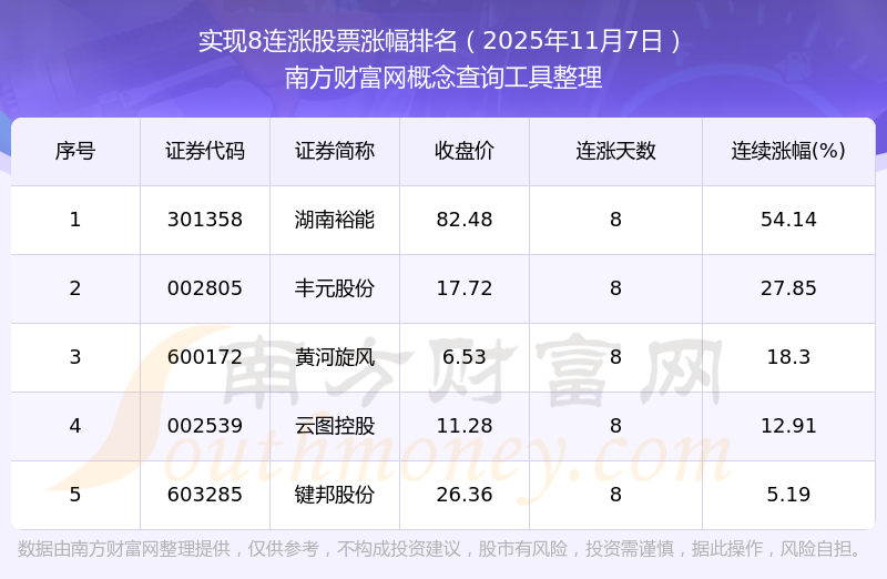 根據(jù)南方財(cái)富網(wǎng)概念查詢工具數(shù)據(jù)統(tǒng)計(jì),截止2025年11月7日收盤,共有5只個股實(shí)現(xiàn)8天連漲。其中連續(xù)漲幅較大的個股有湖南裕能、豐元股份、黃河旋風(fēng)等,連續(xù)漲幅分別為54.14%、27.85%、18.30%。