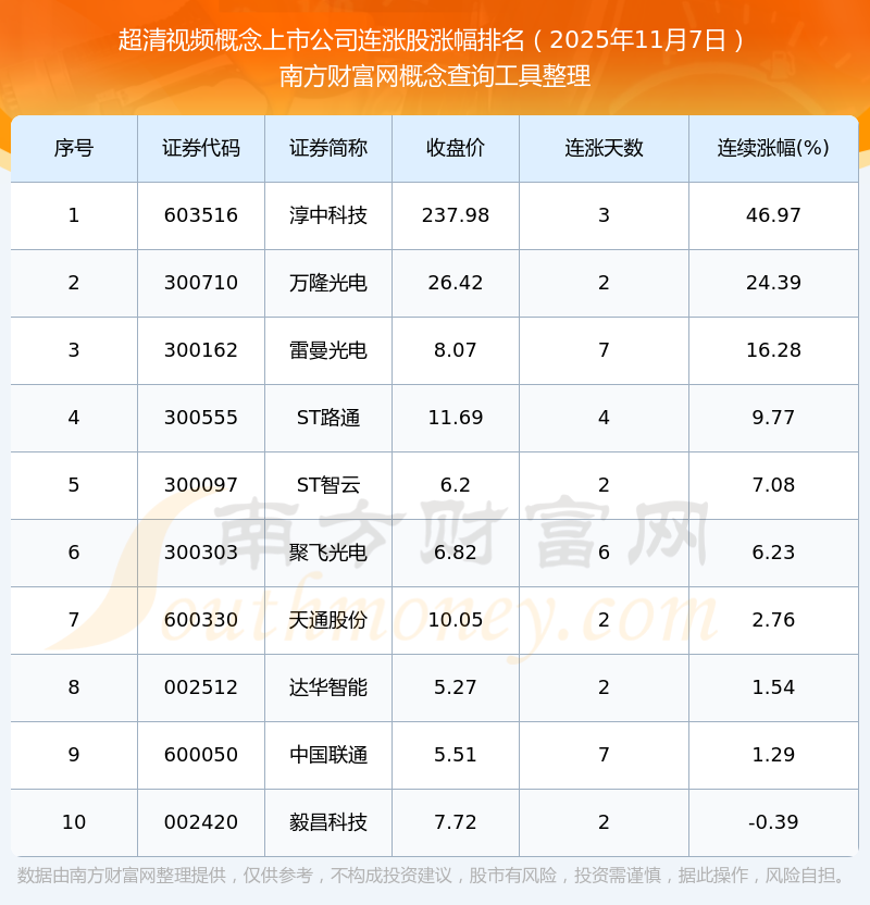 2025年11月7日超清視頻概念上市公司連漲股漲幅排名