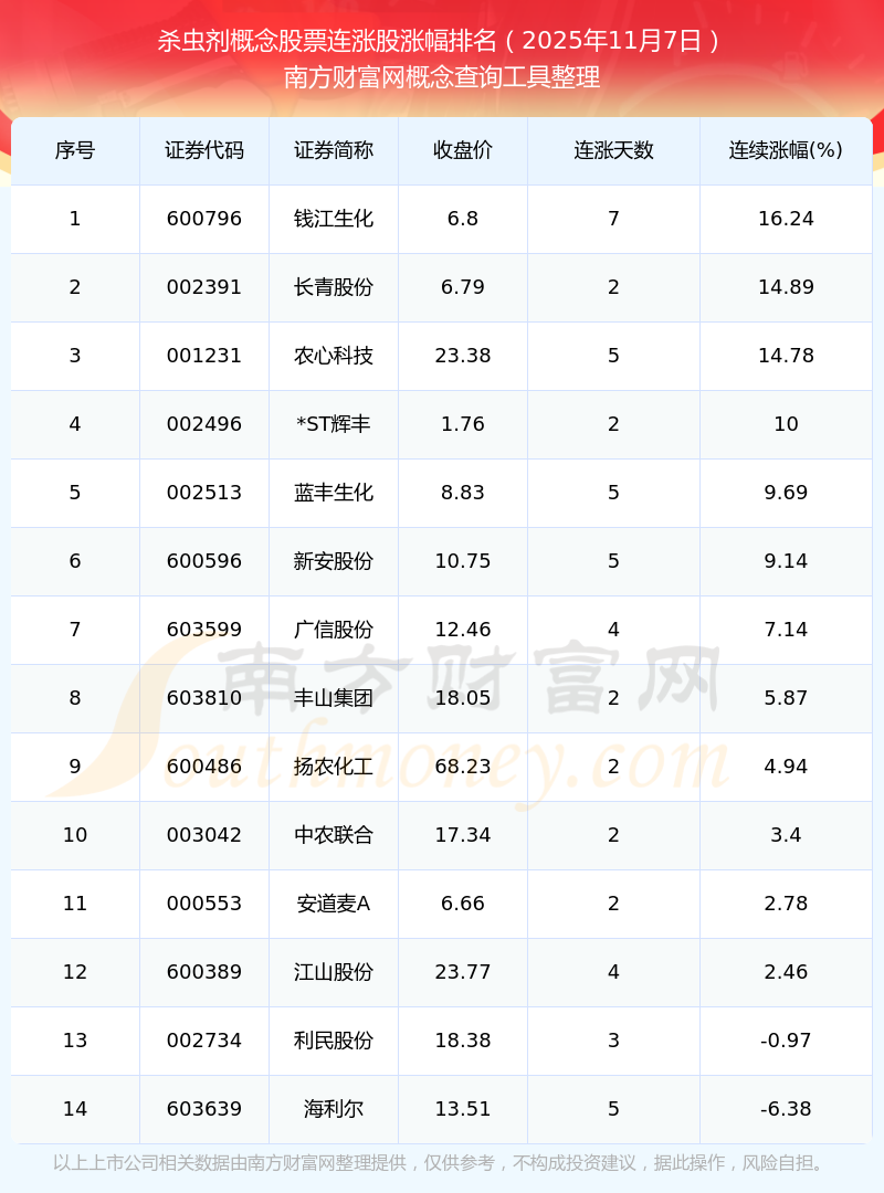 根據(jù)南方財富網(wǎng)概念查詢工具數(shù)據(jù)統(tǒng)計,截止2025年11月7日收盤,殺蟲劑概念股票共有14只個股實現(xiàn)連漲。其中連續(xù)漲幅較大的個股有錢江生化、長青股份、農(nóng)心科技等,連續(xù)漲幅分別為16.24%、14.89%、14.78%。