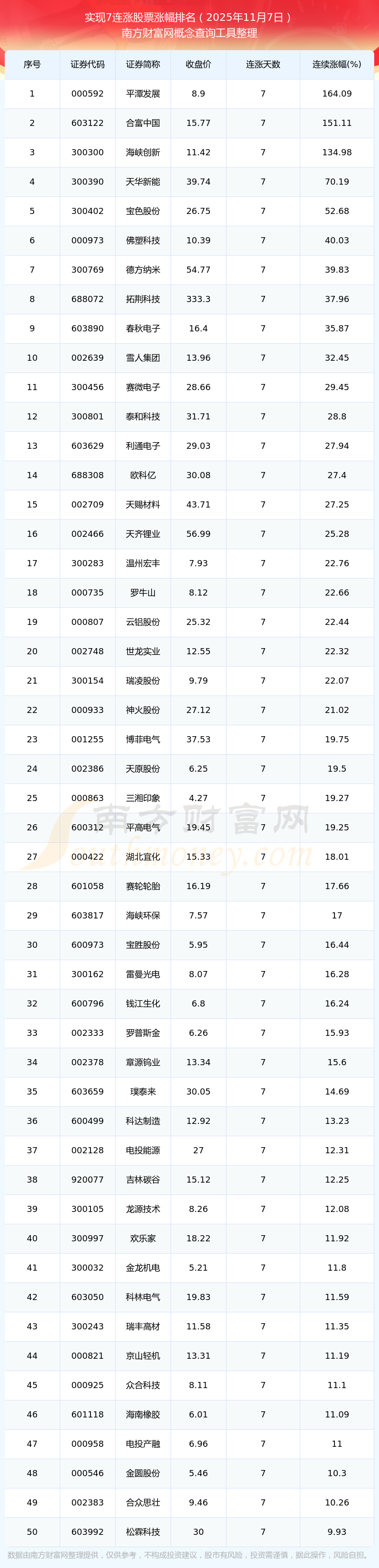 2025年11月7日實(shí)現(xiàn)7連漲股票漲幅排名