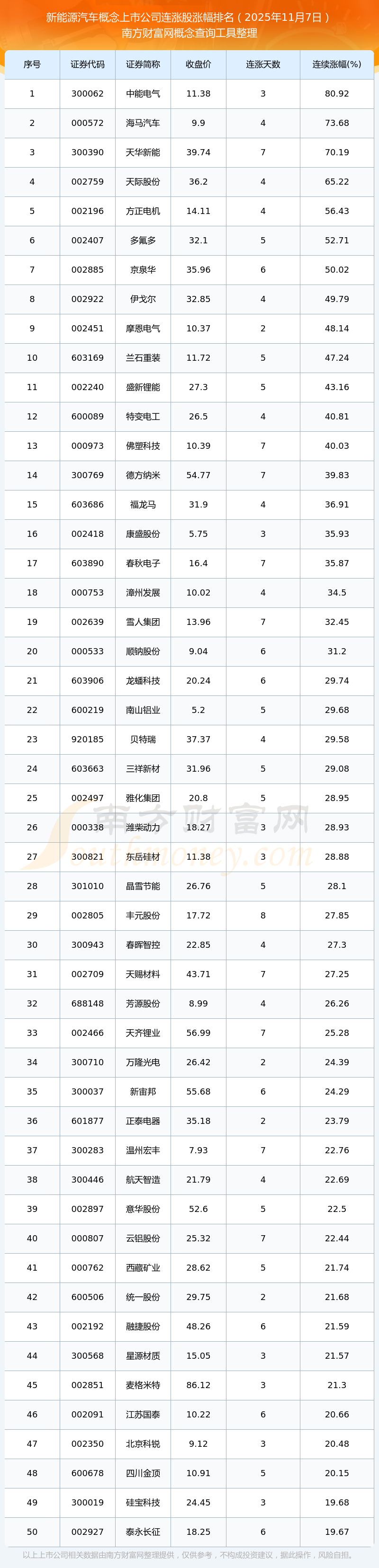 2025年11月7日新能源汽車概念上市公司連漲股漲幅排名