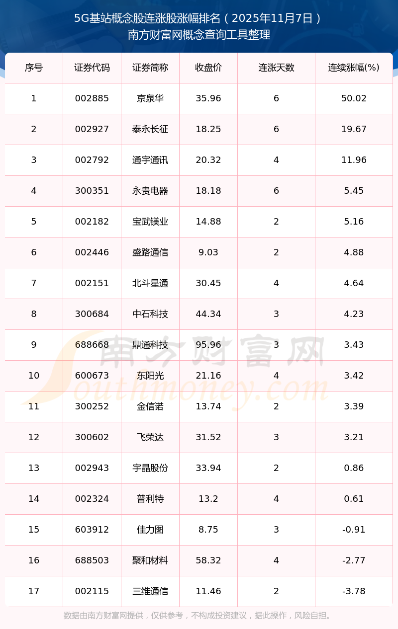 根據(jù)南方財富網(wǎng)概念查詢工具數(shù)據(jù)統(tǒng)計,截止2025年11月7日收盤,5G基站概念股共有17只個股實(shí)現(xiàn)連漲。其中連續(xù)漲幅較大的個股有京泉華、泰永長征、通宇通訊等,連續(xù)漲幅分別為50.02%、19.67%、11.96%。