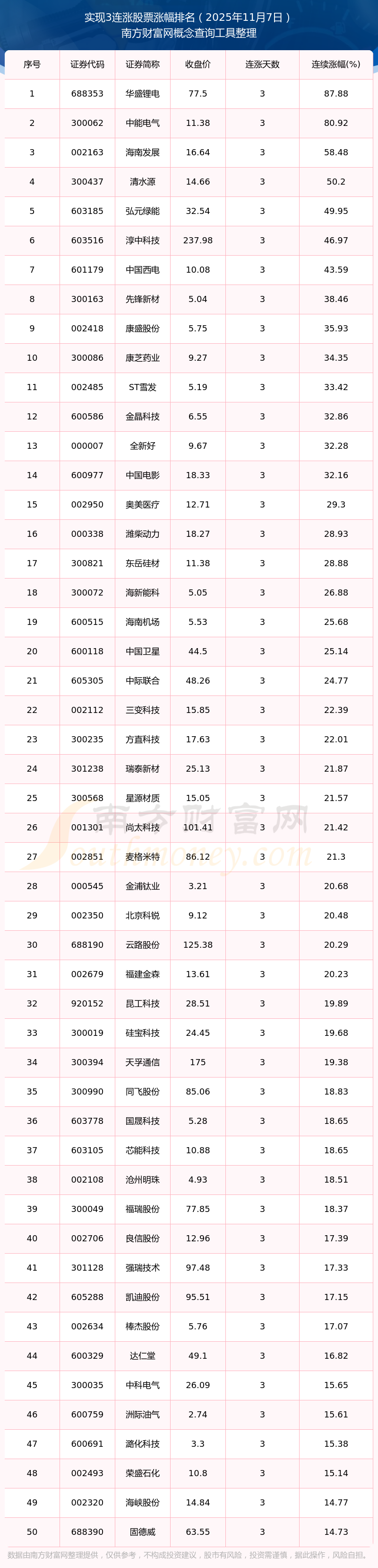 2025年11月7日實(shí)現(xiàn)3連漲股票漲幅排名